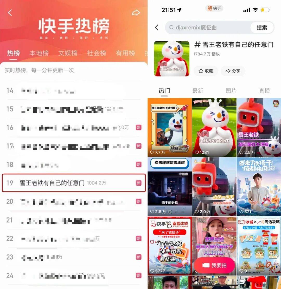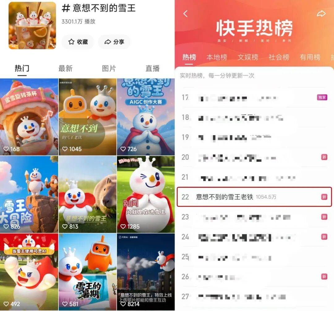 这次AIGC创意大赛还激发了用户的强社交主动性,诞生了多个社交氛围话题,其中话题#雪王老铁有自己的任意门 登陆快手热榜TOP19,快手站内话题曝光1784.7w+。
