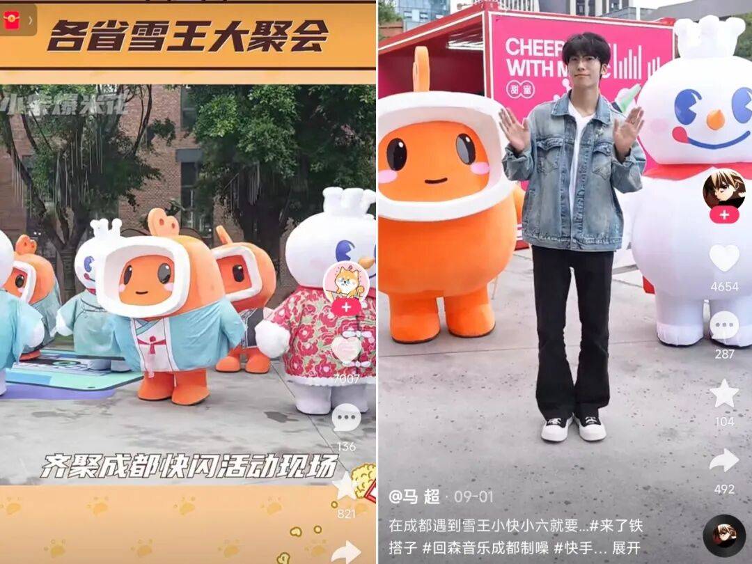 在线下,“雪王”和“小快”、“小六”在成都快闪活动现场组成“铁搭子”联盟,穿上了各省省服上演地域梗,请来快手达人@马超 等与雪王、小快共舞,在成都地区制造出了一场线下爆点事件。由线下活动衍生的视频物料,在快手站内形成了二次传播。