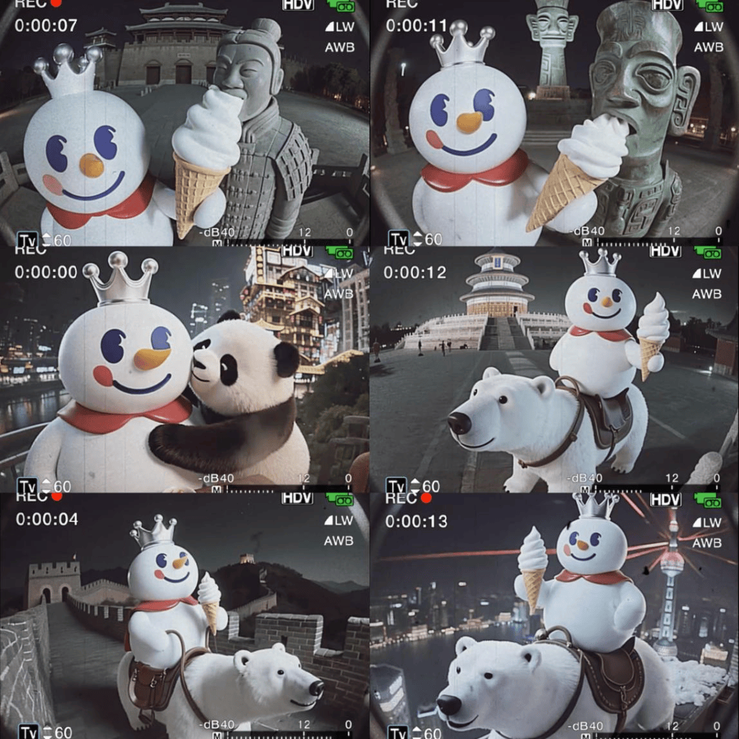 在这次大赛的showcase中,一则抽象视频以纪录片质感的第一视角,创作出了雪王带你夜间打卡知名地标建筑系列作品。雪王骑熊夜游,从东方明珠塔到西安秦始皇兵马俑、北京天坛、长城、重庆洪崖洞、乐山大佛,一路豪请兵马俑、三星堆、国宝熊猫吃雪王冰激凌。“举报这几家奶茶店”“这不就是搞抽象吗?”