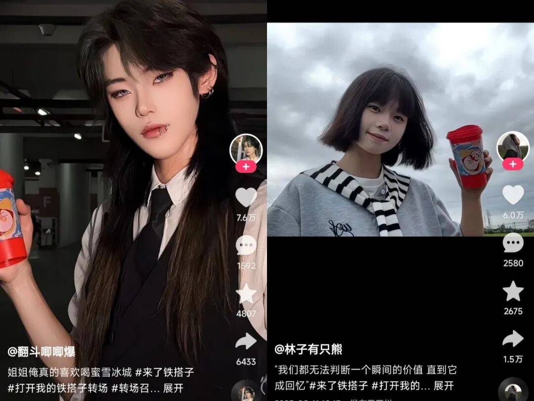 为调动更多年轻消费者参与的积极性,“雪王”IP带头整活,结合暑期旅游热,发起#打开我的铁搭子转场挑战赛,以手持联名周边+城市的地标转场、变装转场玩法,吸引用户带朋友一起参与,提升周边曝光。