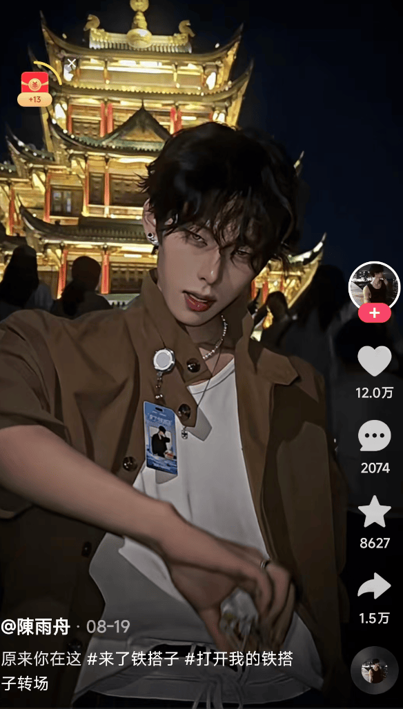 如快手达人@陈宇舟拍摄的#打开我的铁搭子转场视频,背景就选择了在了重庆地标性建筑鸿恩寺。