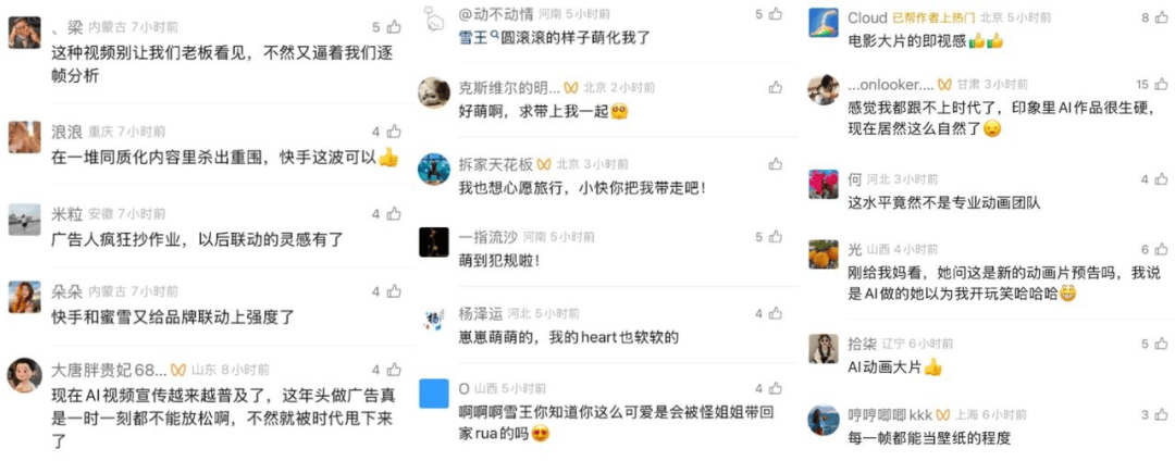 这则由可灵AI承制的宣传短片风评极佳,其专业先进的技术得到了业内技术大佬的认可,软萌可爱的IP形象斩获了一众消费者喜爱,跨界联名IP营销的成功案例更是得到了专业营销从业者的肯定。