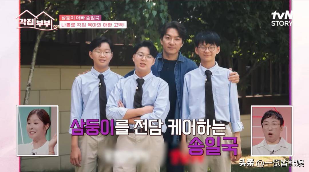 镜头前的宋一国让观众险些不敢相认——这位以俊朗形象著称的韩流演员,在最新综艺中竟显露出远超年龄的疲惫。昔日荧幕上风度翩翩的型男,如今眼角的细纹与略显松弛的面容无声诉说着抚养三胞胎(大韩、民国、万岁)的艰辛。网友唏嘘评论:"带一个娃老五岁,他带三个直接沧桑十岁!"