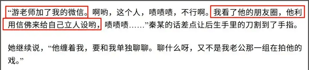 秦雯还吐槽游本昌,游老师主动加了她的联系方式,结果秦雯说看了游本昌的朋友圈,“他利用信佛来立人设”,还不耐烦游本昌缠着她聊剧情,又不是她老公负责拍游本昌。