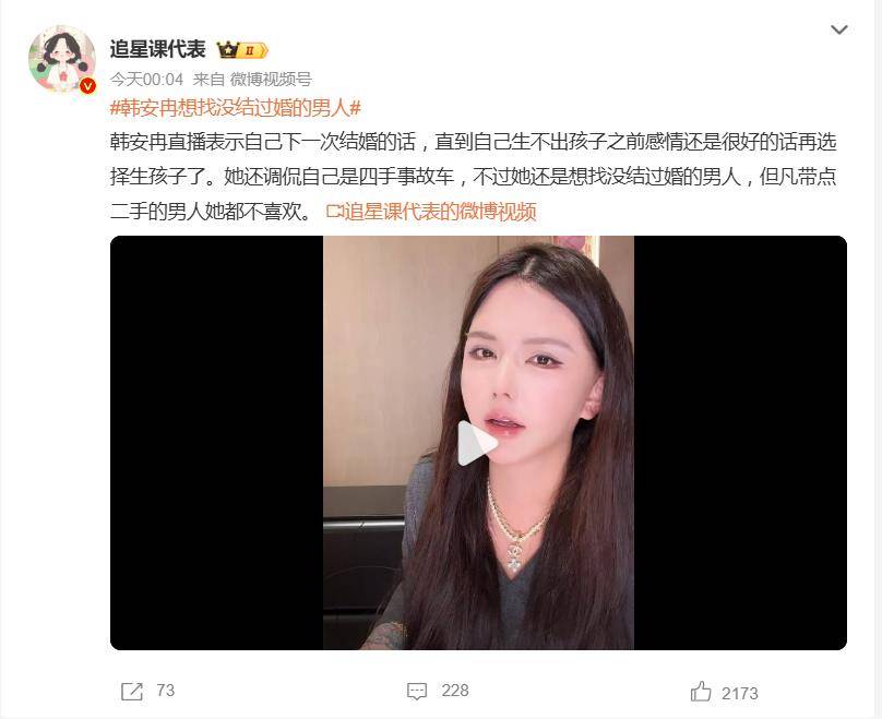“下次结婚,得找个没结过婚的。”近日,韩安冉在直播间里甩出这句话,瞬间点燃了围观网友的八卦神经。这位26岁却已历经四段婚姻的网红,一边自嘲是“四手事故车”,一边却明确表示“但凡带点二手的男人都不喜欢”,这番“双标”操作直接把自己送上了热搜。
