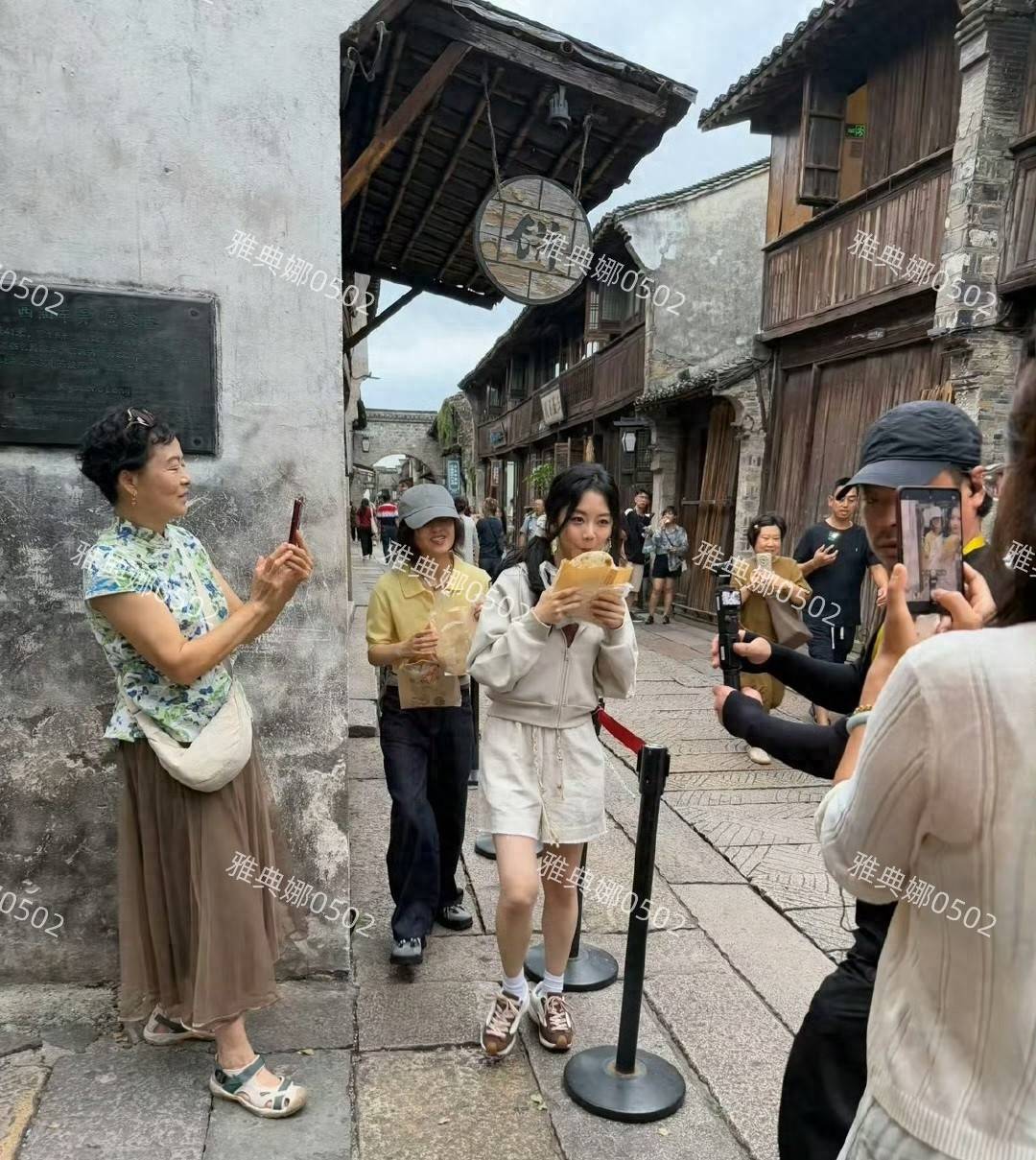 张子枫则以鹅黄色T恤配深蓝牛仔裤的休闲装扮现身,灰色棒球帽与腰包的搭配更添几分俏皮。两人一前一后漫步在古镇街头,宛如结伴秋游的中学生,散发着青春活力。
