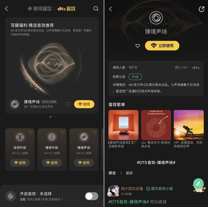 用户打开QQ音乐APP进入“音效”界面,点击“DTS音效“即可解锁以上三款联名音效,直观感受技术赋能下的至臻音乐享受。
