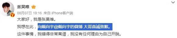传闻刚发酵时,张昊唯就火速发微博道歉,称是多年前闲聊的不实八卦被加工传播,自己和戴向宇素不相识。