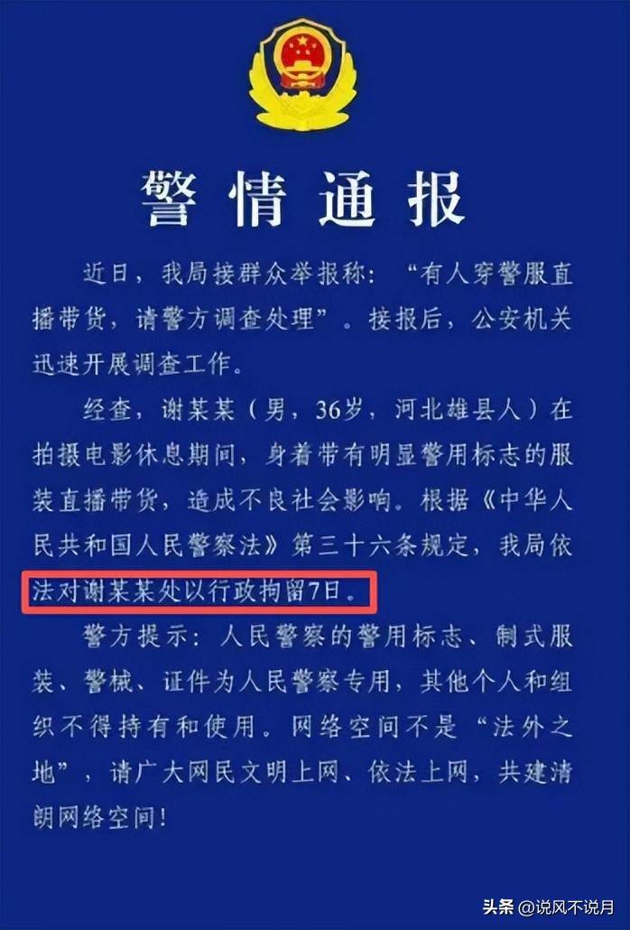 9月17日,云南警方发布了一则通报,通报里称谢某某,就是我们熟知的演员谢孟伟嘎子,因为在拍摄电影休息期间,身着带有明显警用标志的服装直播带货,造成了不良的社会影响。