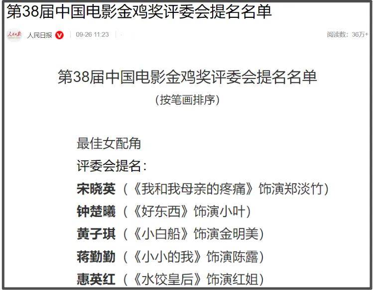获得最佳女配角提名的有宋晓英、钟楚曦、黄子琪、蒋勤勤、惠英红。
