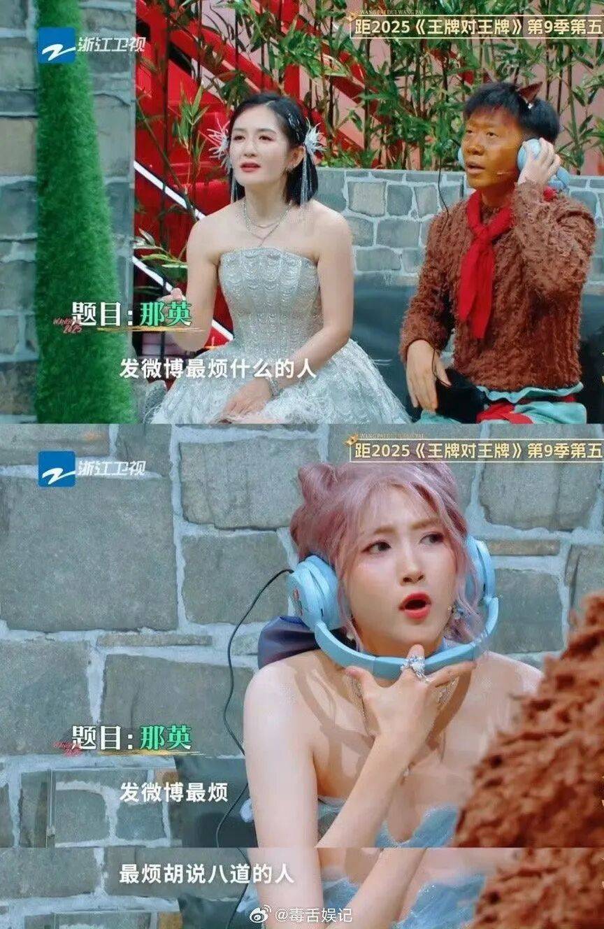 在2025年9月播出的《王牌对王牌》第九季猜词游戏中,题目要求嘉宾猜测艺人“那英”。主持人杨迪给出提示:“发微博说最烦什么的人”,意图引导嘉宾联想到那英的经典言论“最烦装逼的人”。