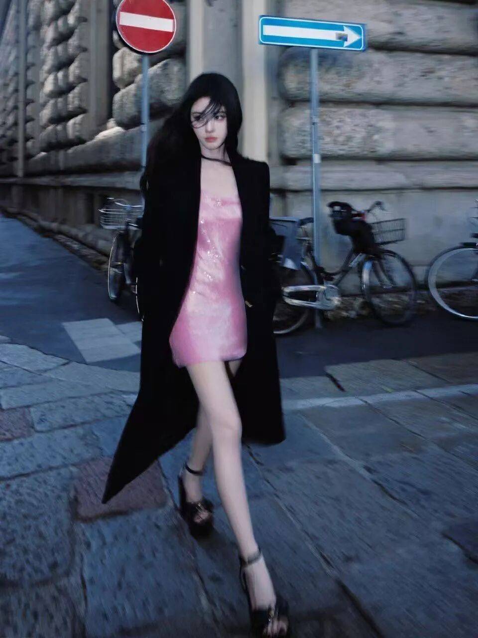 9月26日,著名女星鞠婧祎参加米兰时装周的造型曝出,魅力十足!图中,鞠婧祎穿粉色亮片吊带裙,她俏脸冷艳,浓眉大眼,烈焰红唇,乌黑的秀发如瀑布般飘逸,露出白皙的手臂,肌肤娇嫩如雪,这位美女坐在水边氛围感十足,既冷艳动人,又性感妩媚!