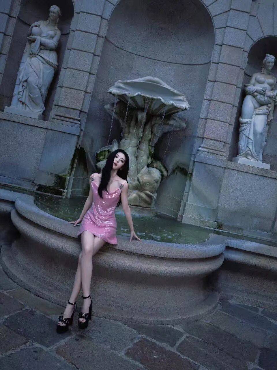 鞠婧祎穿粉色亮片吊带裙,她俏脸冷艳动人,乌黑的秀发飘逸,她坐在水池边上,就像一个冷艳的仙子。