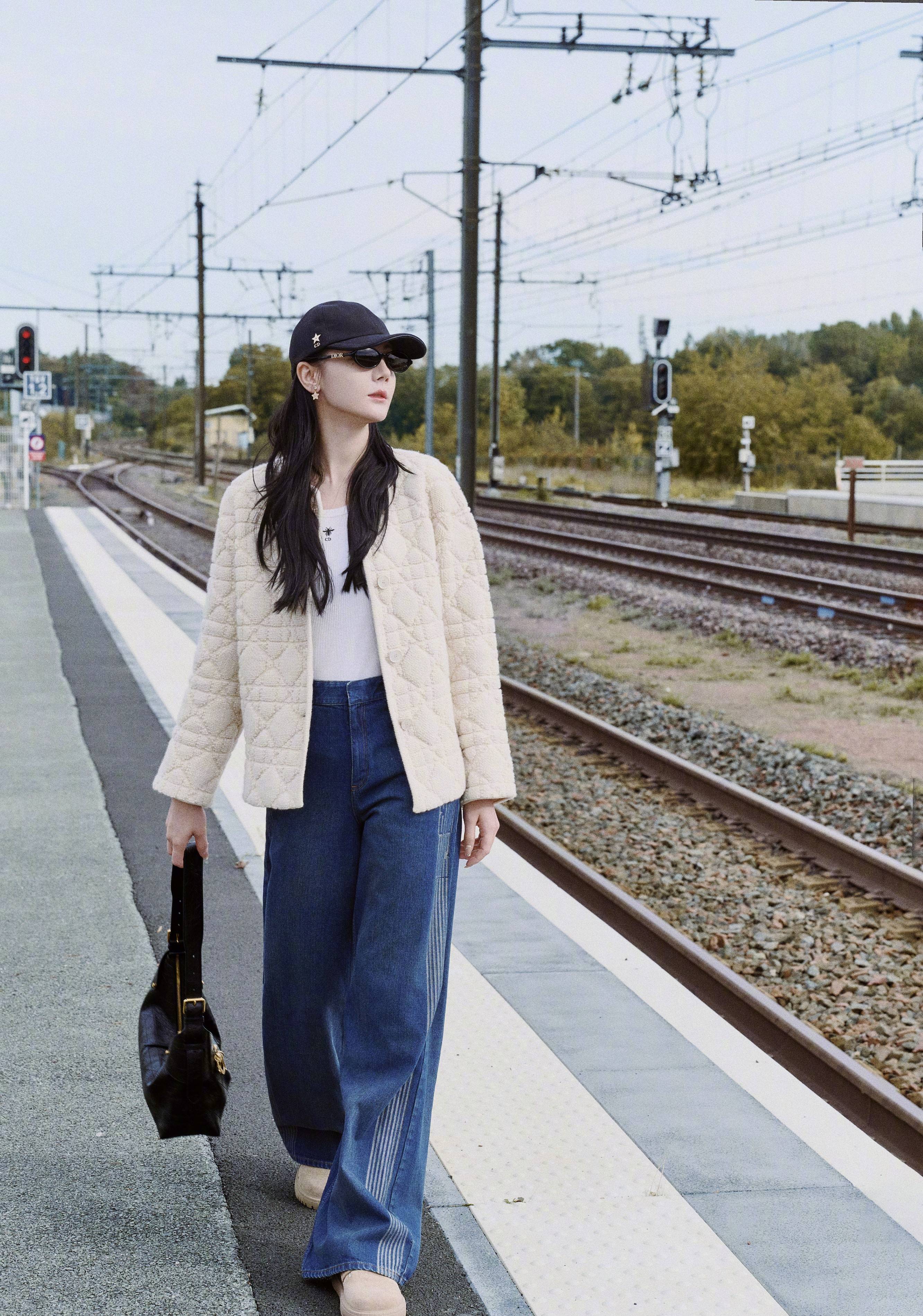 迪丽热巴穿白色外套搭配牛仔裤,慵懒时尚。