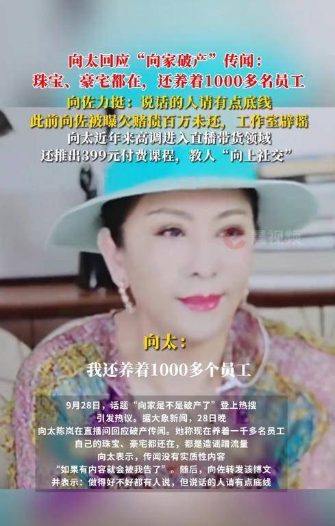 就在“向家破产”热搜词条登上当晚,向太就开直播进行了回应,她表示: