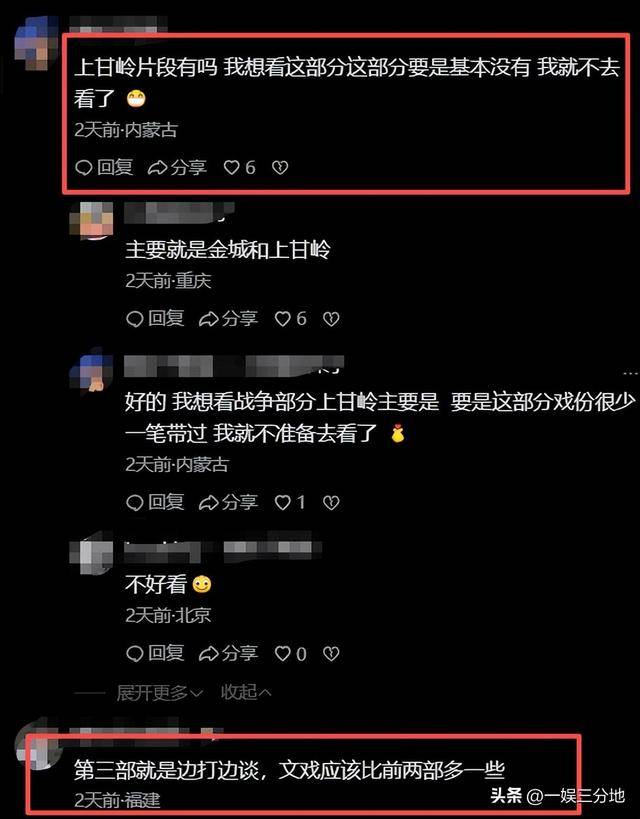 这不,就有观众表示:“第三部中,有没有上甘岭桥段,没有的话,就不去看了。”