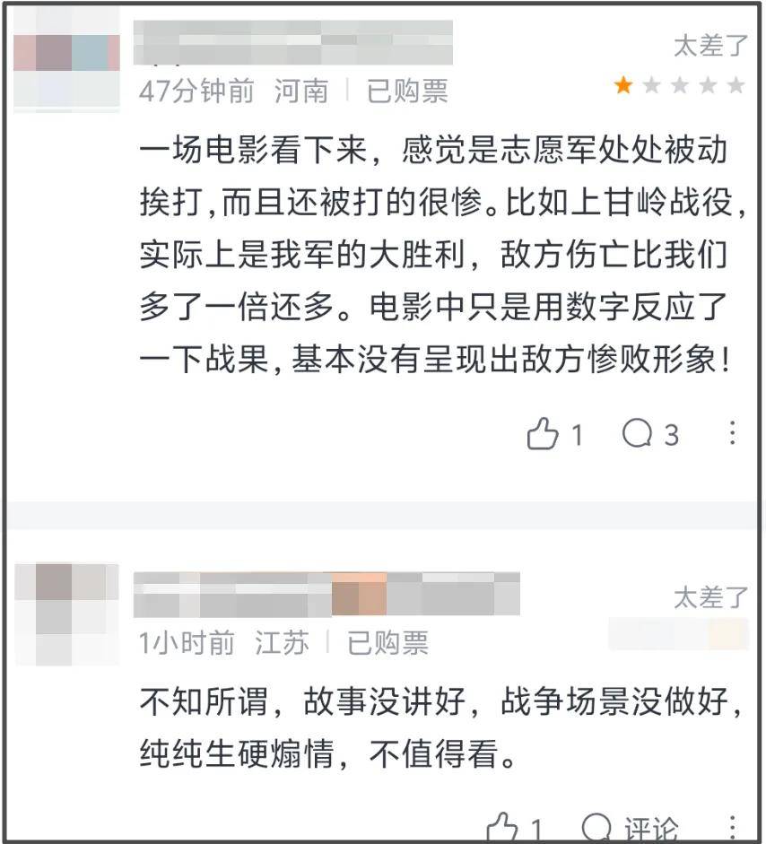 老式主旋律片又来了,甚至连槽点都没变化,《志愿军》上到第三部了,上映两天票房破亿艰难,有观众反馈最期待的上甘岭战役都没拍好,不应该啊!