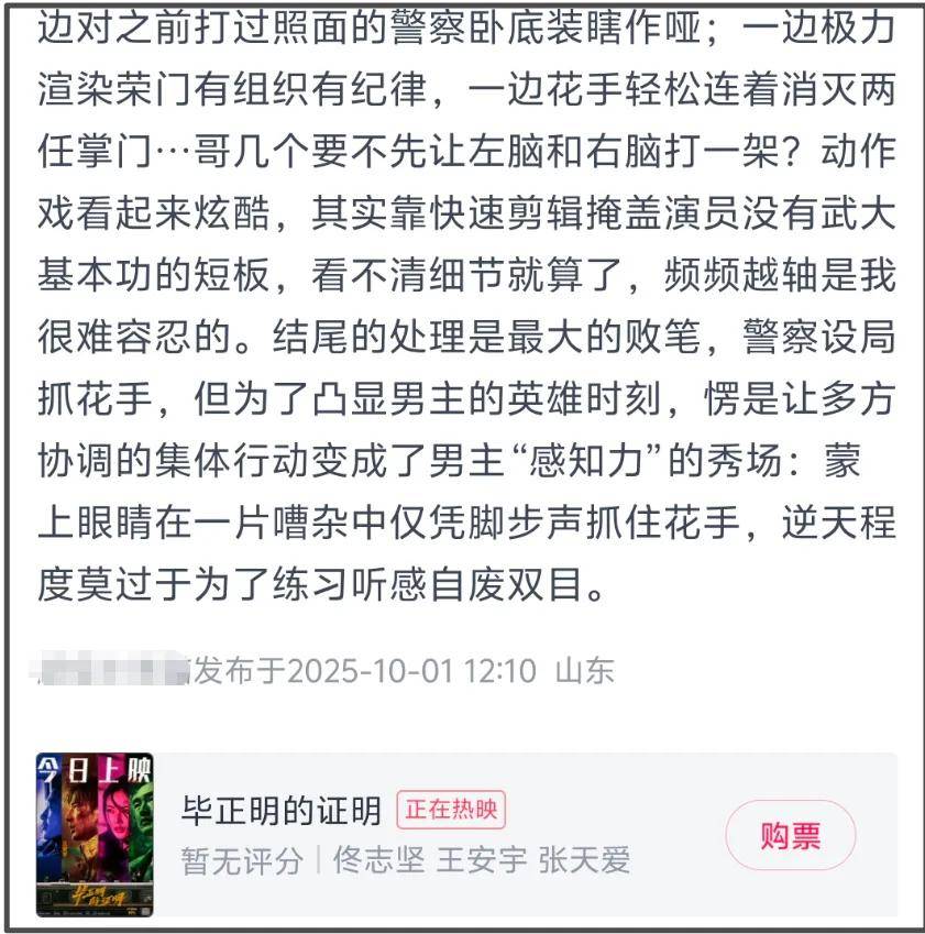 王安宇饰演的男主毕正明都放在电影标题了,他演了一个意外致残的警察,为了证明自己闯入了盗贼团伙,故事主题是反扒,但众所周知,一部凸显主角还带有个人英雄主义色彩的片子,演员最好还是有点票房号召力,不然很容易自娱自乐。