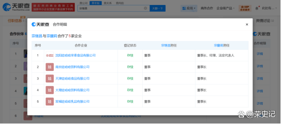 数据不会撒谎。根据天眼查数据显示,宗馥莉和杜建英存在共同关系的公司一共有12家,其中陕西娃哈哈乳品有限公司、南京娃哈哈饮料有限公司等7家企业的股东名单上竟然出现了杜建英的长子宗继昌的名字。