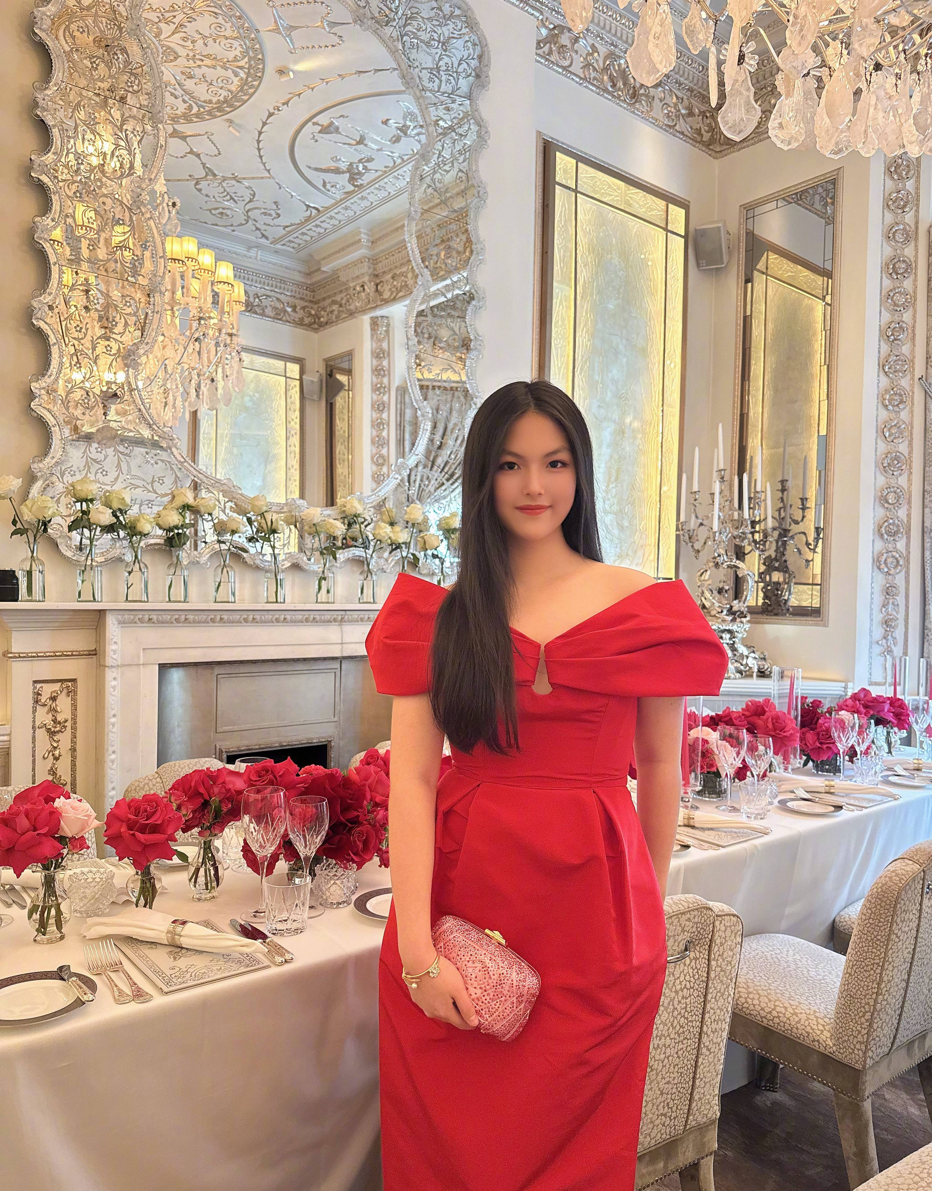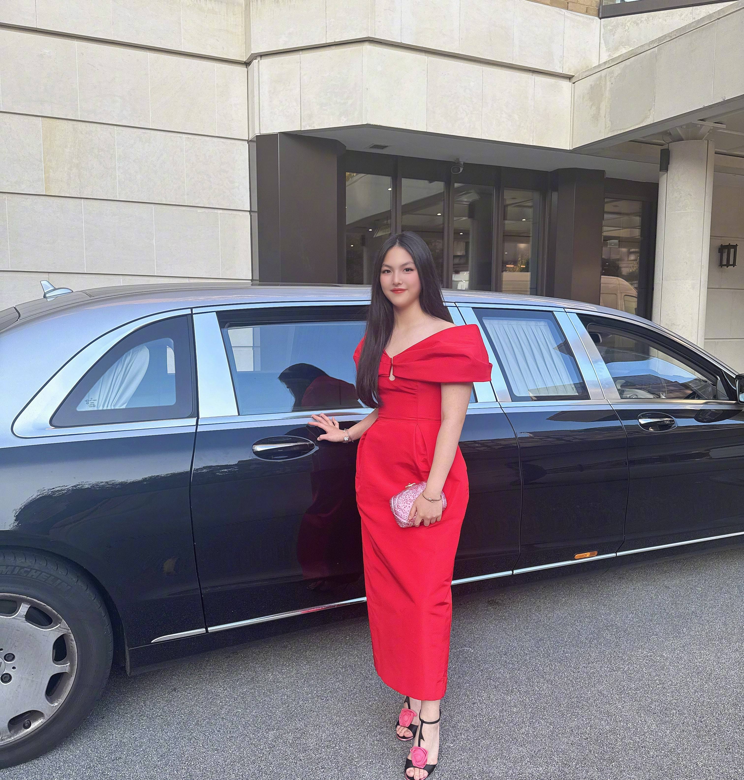 王诗龄站在黑色豪车旁,笑容优雅。