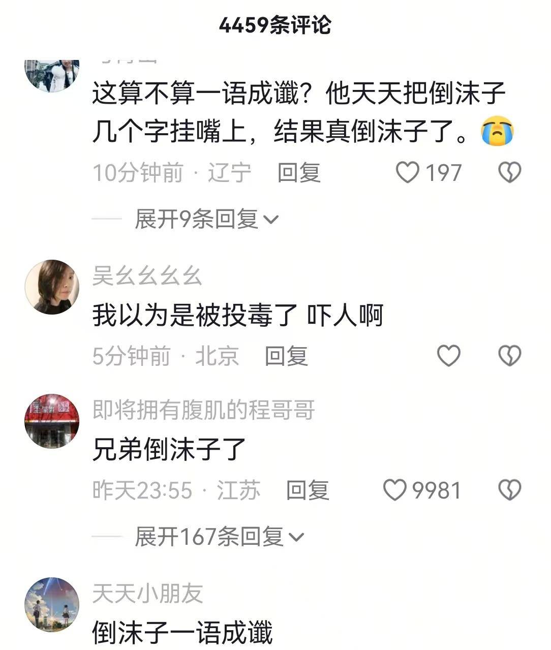 网友得知他摔倒了的消息,是这样留言的,这算不算一语成谶,他天天把倒沫子几个字挂嘴上,结果真的倒沫子了。