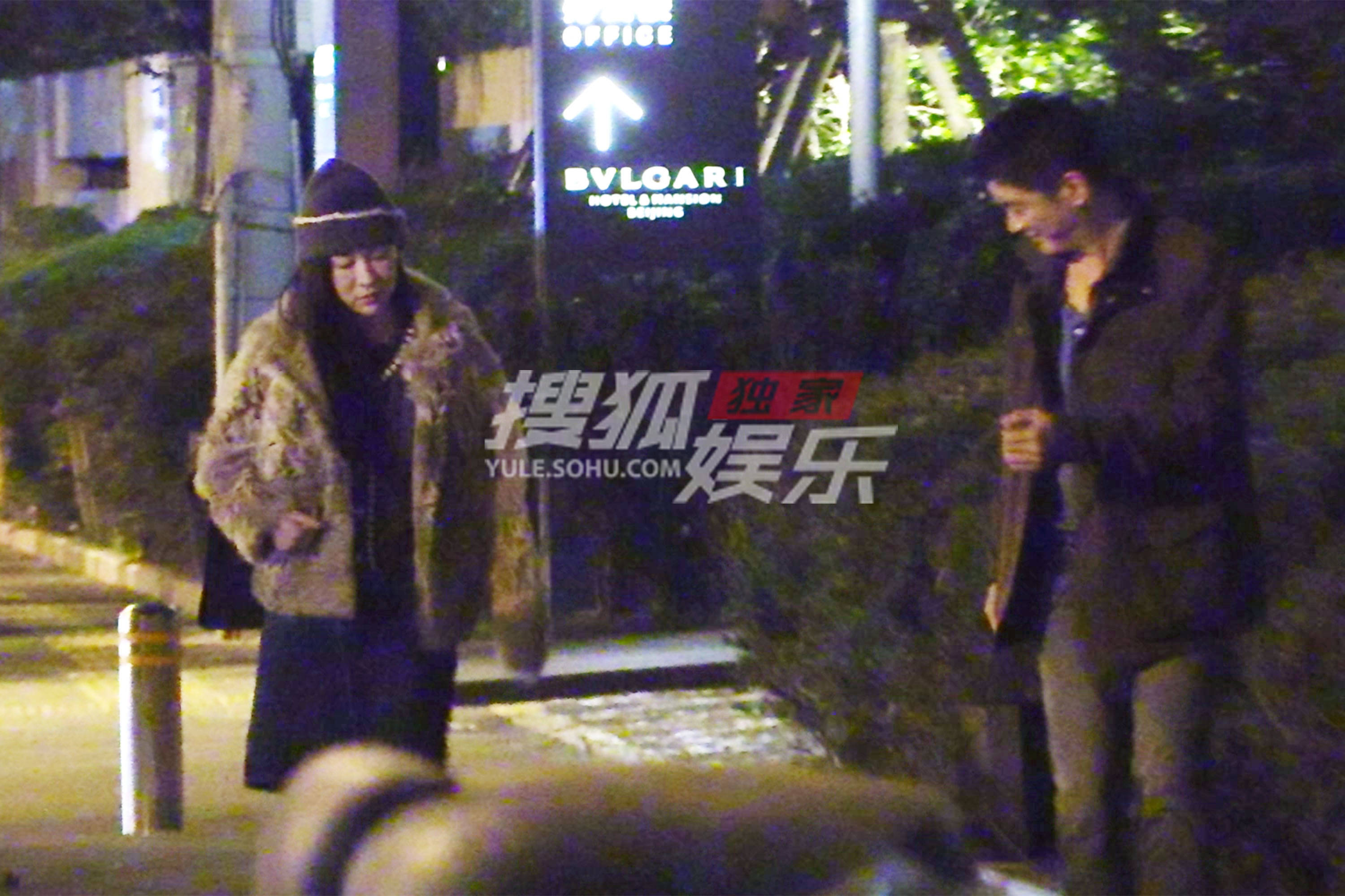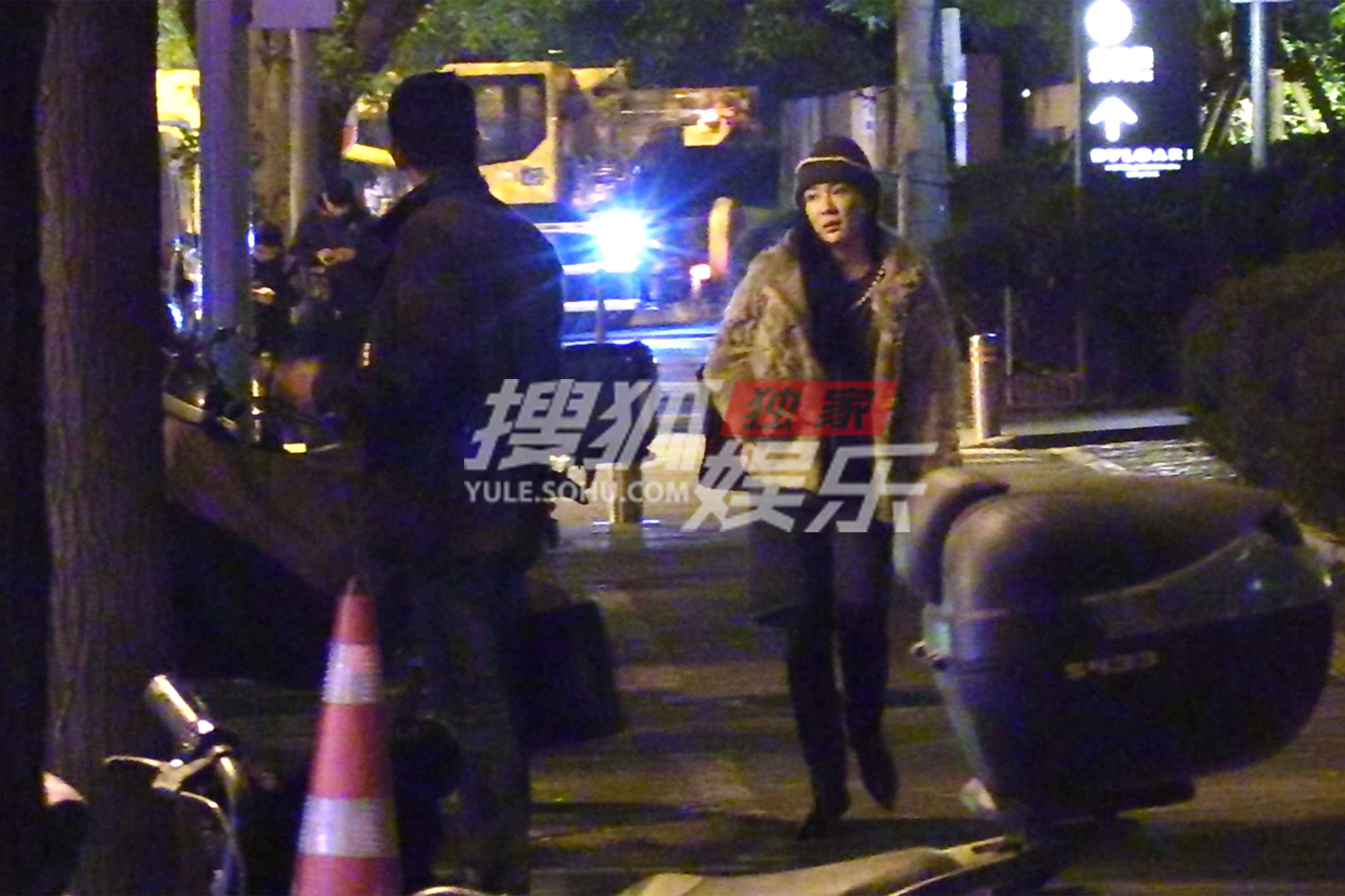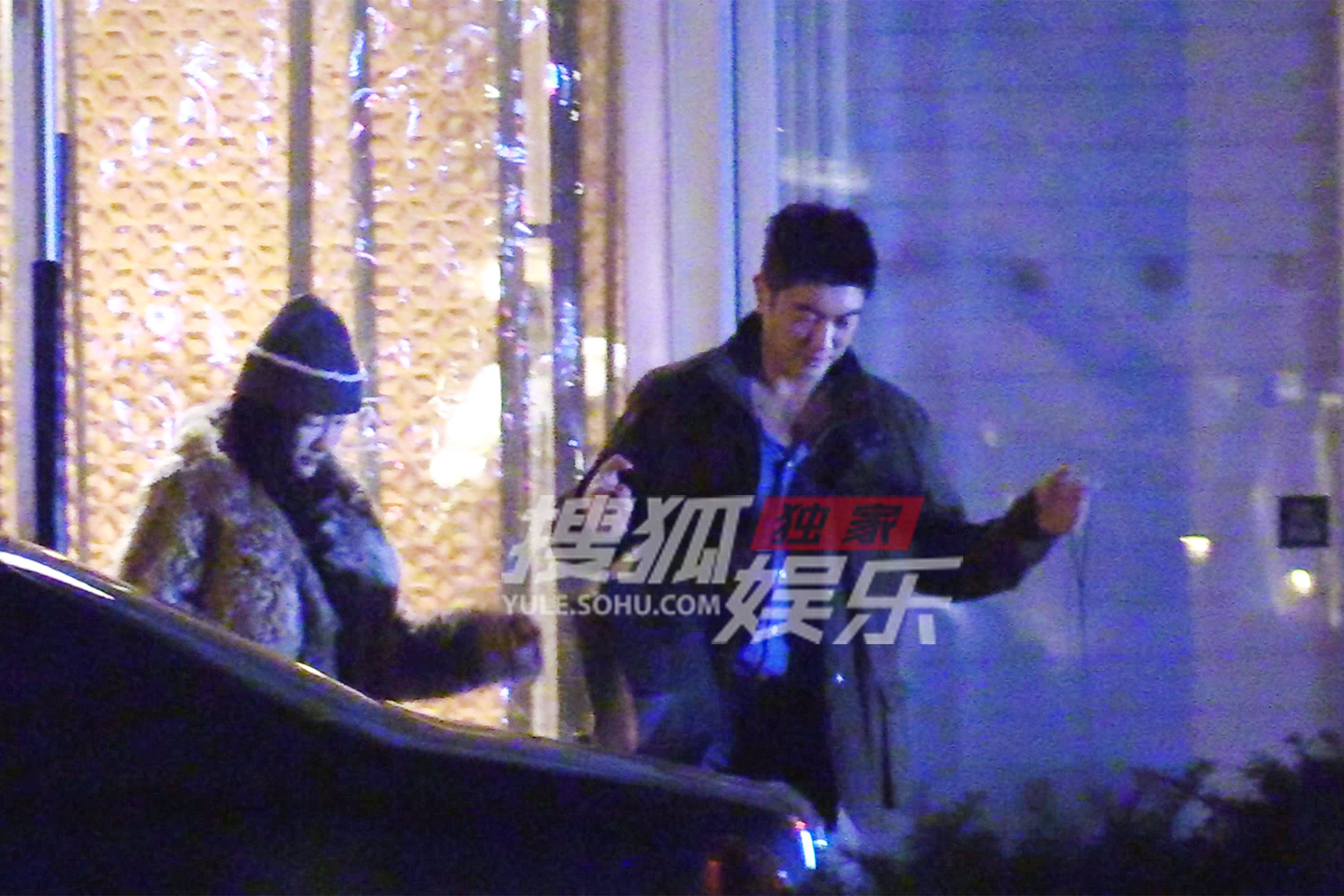 霍思燕戴着暖和的毛线帽,穿着皮草外套和靴子,跟在杜江后面看着特别娇嫩。