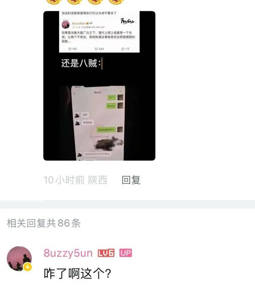 有网友拿Buzzy曾经的聊天记录问Buzzy,(龙崎给Buzzy发自己偷拍和女性的X爱录像,Buzzy回复恭喜)Buzzy先是表示:咋了?