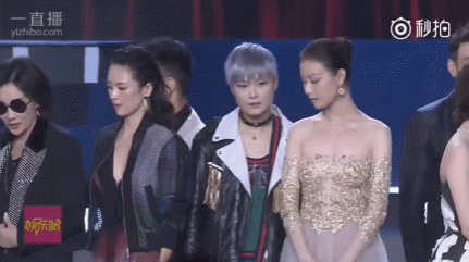 似乎就是因为她守着中间位置不往旁边站,才让主办方和顶流没地儿站。