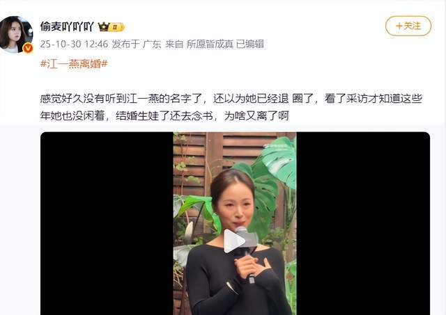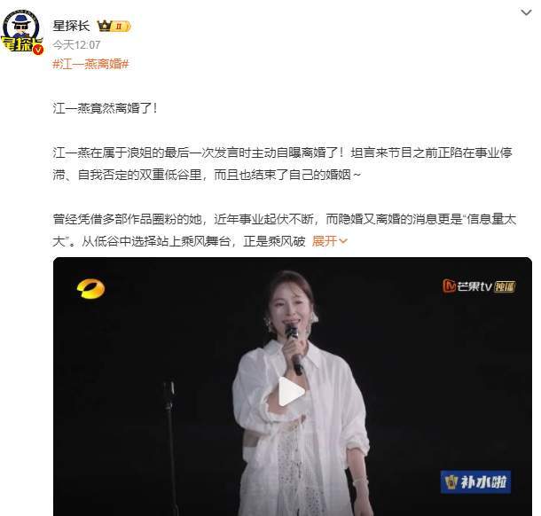 10月30号,江一燕在综艺节目《假期中的她们》收官环节主动透露已结束婚姻,另外,她还透露此前经历了事业停滞以及自我否定的双重低谷,不过她在节目中通过女性互助获得了力量,对未来也有了一定的信心。