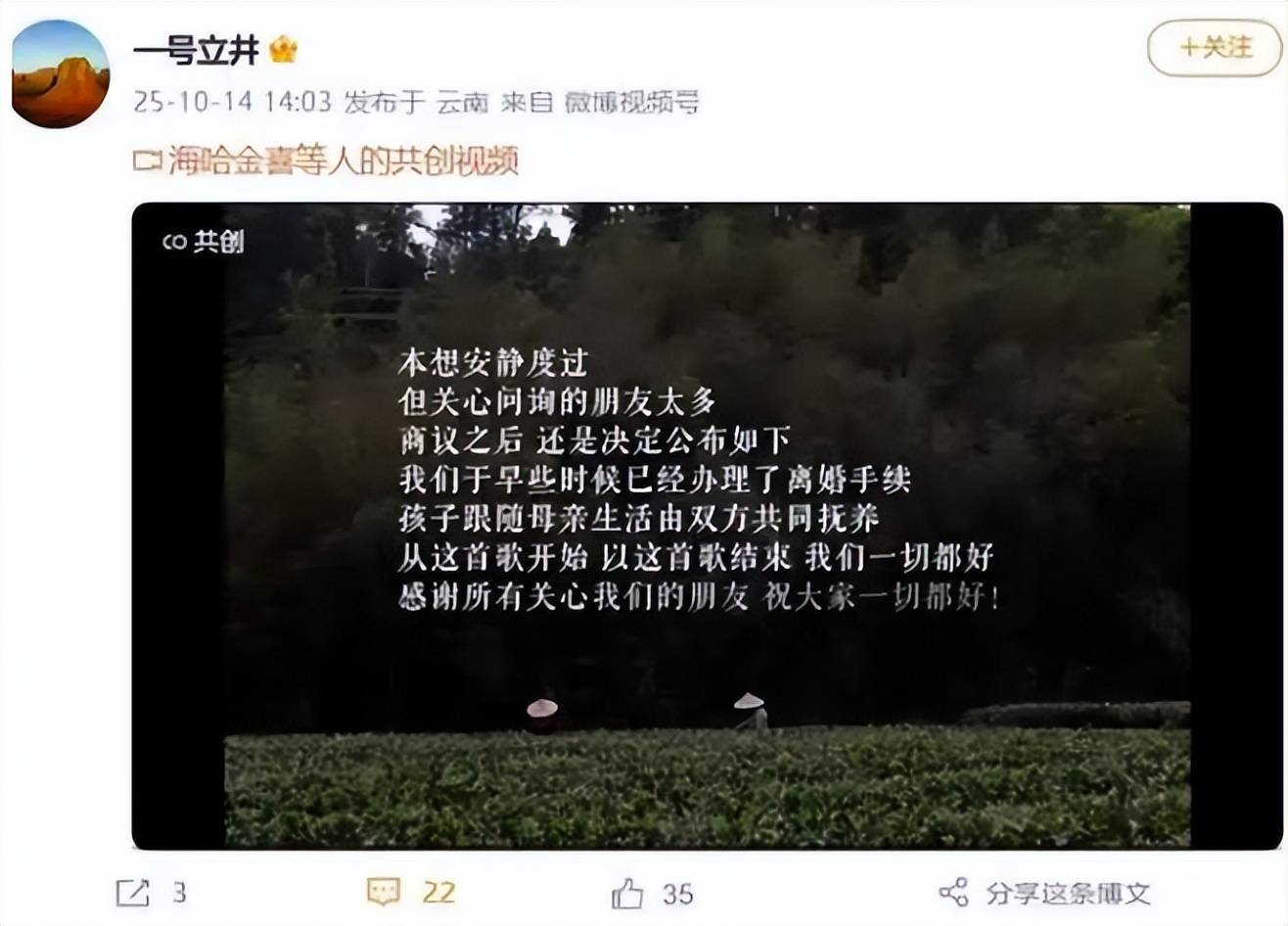 10月14日,李亚鹏和妻子海哈金喜,共同在社交平台上官宣离婚。
