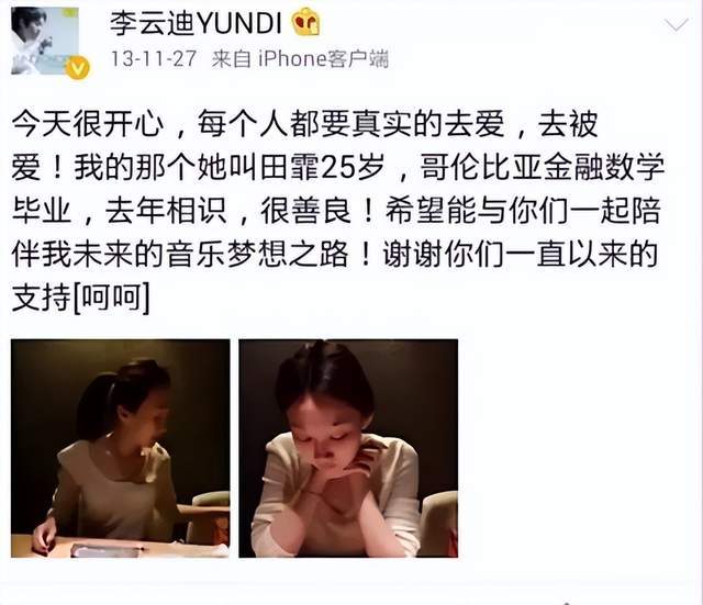 李云迪公开过的女友只有一位,2013年在王力宏官宣结婚之后,李云迪也官宣了女友田霏,对方她毕业于哥伦比亚大学附属巴纳德学院金融数学专业,曾就职于中信证券。据悉,2012年两人在公司年会上相识后多次同游,恋情持续至2016年9月正式分手。在此之前,李云迪一直有一位网传的前任华真,但他并没有公开回应过。