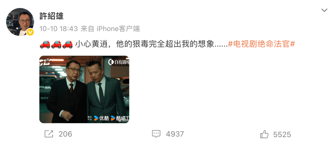 不过,即便摆出万事随缘的淡然态度,许绍雄始终在跟随着行业前进,从未想过退休,“应该会演到死吧,因为没想过退休的事情。”许绍雄的最后一条微博停留在半个月前,那时他还在为新剧《绝命法官》做宣传。