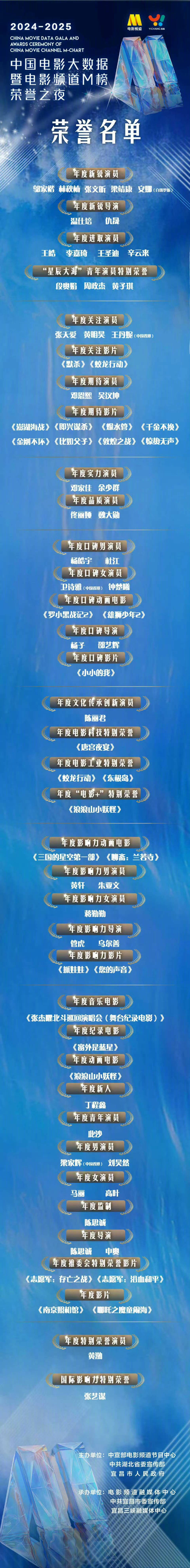 搜狐娱乐讯 2024-2025年度中国电影大数据暨电影频道M榜荣誉之夜荣誉名单出炉↓↓(按颁发顺序):