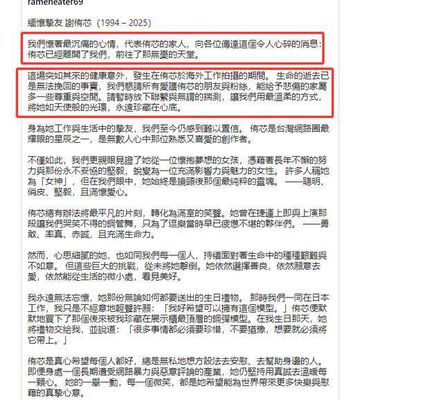 据发布这一噩耗的好友透露,谢侑芯是因为健康问题在海外工作的时候猝逝,但具体是哪一种健康问题,暂时没有交代。不过有网友猜测,很可能与整形有关系,但具体是哪一方面,目前并不清楚。