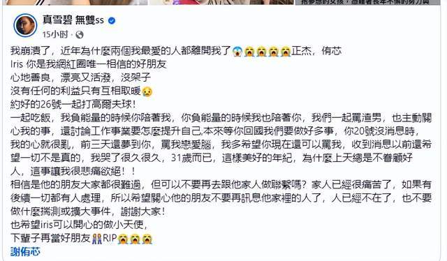 噩耗传出之后,谢侑芯的好友雪碧发文证实这一噩耗,并悲痛表示:谢侑芯是她在网红圈唯一的朋友,心地善良没有架子,也没有任何的利益只有相互取暖。