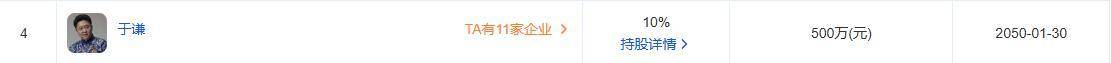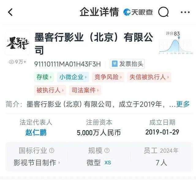 信息显示,于谦持股10%的墨客行影业已累计6条被执行人记录,总金额超7500万元。