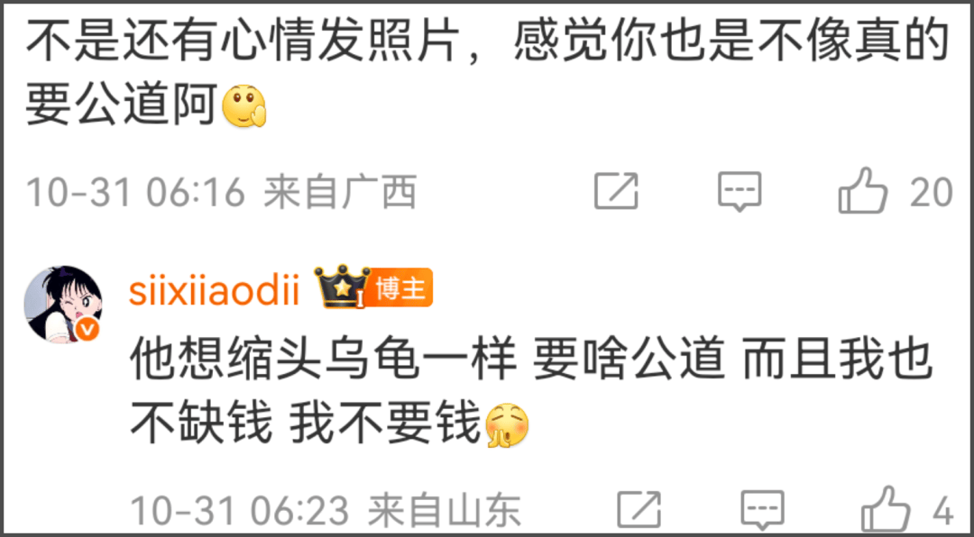 有网友质疑她爆料还有心情晒美照,不像讨公道的样子,她又吐槽李云迪是“缩头乌龟”,时隔两个月还把她拉黑了,她不缺钱也不想要钱,看样子是单纯想曝光李云迪的恶劣行为。