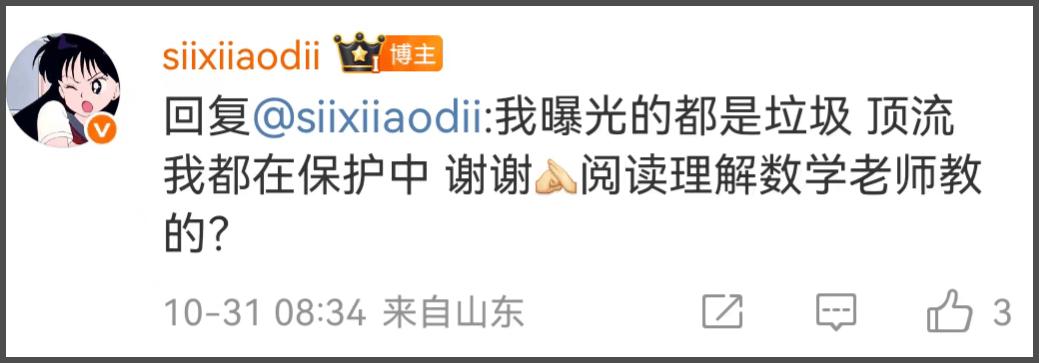 但当网友细问都和哪些顶流谈过,司晓迪又说自己会保护顶流,永远不会曝光,并强调自己曝光的都是“垃圾”。