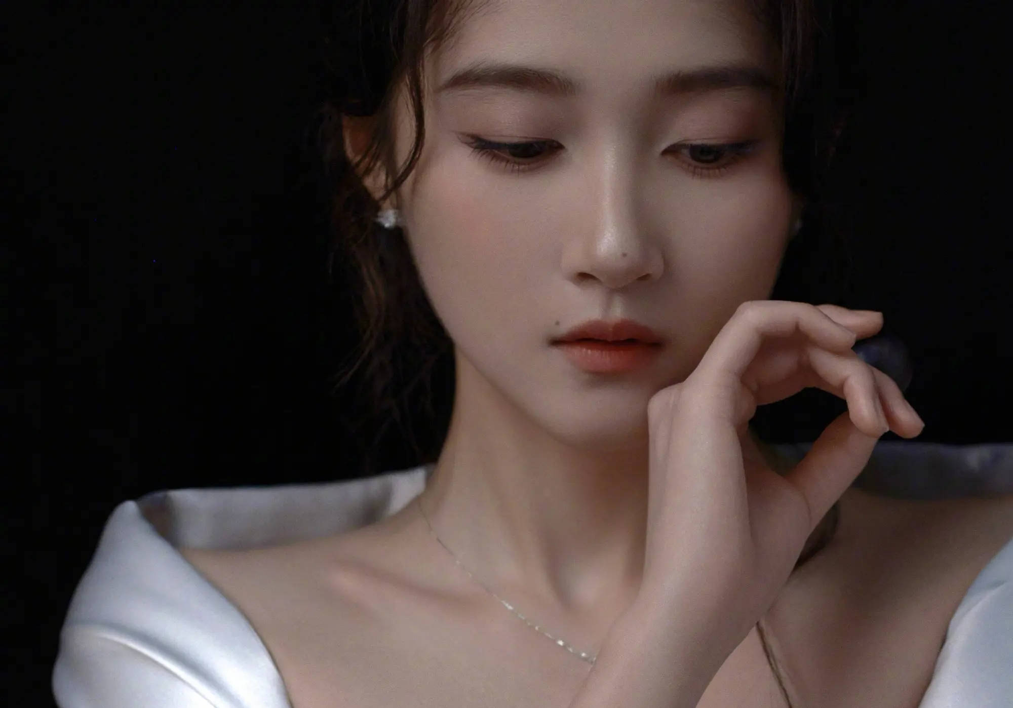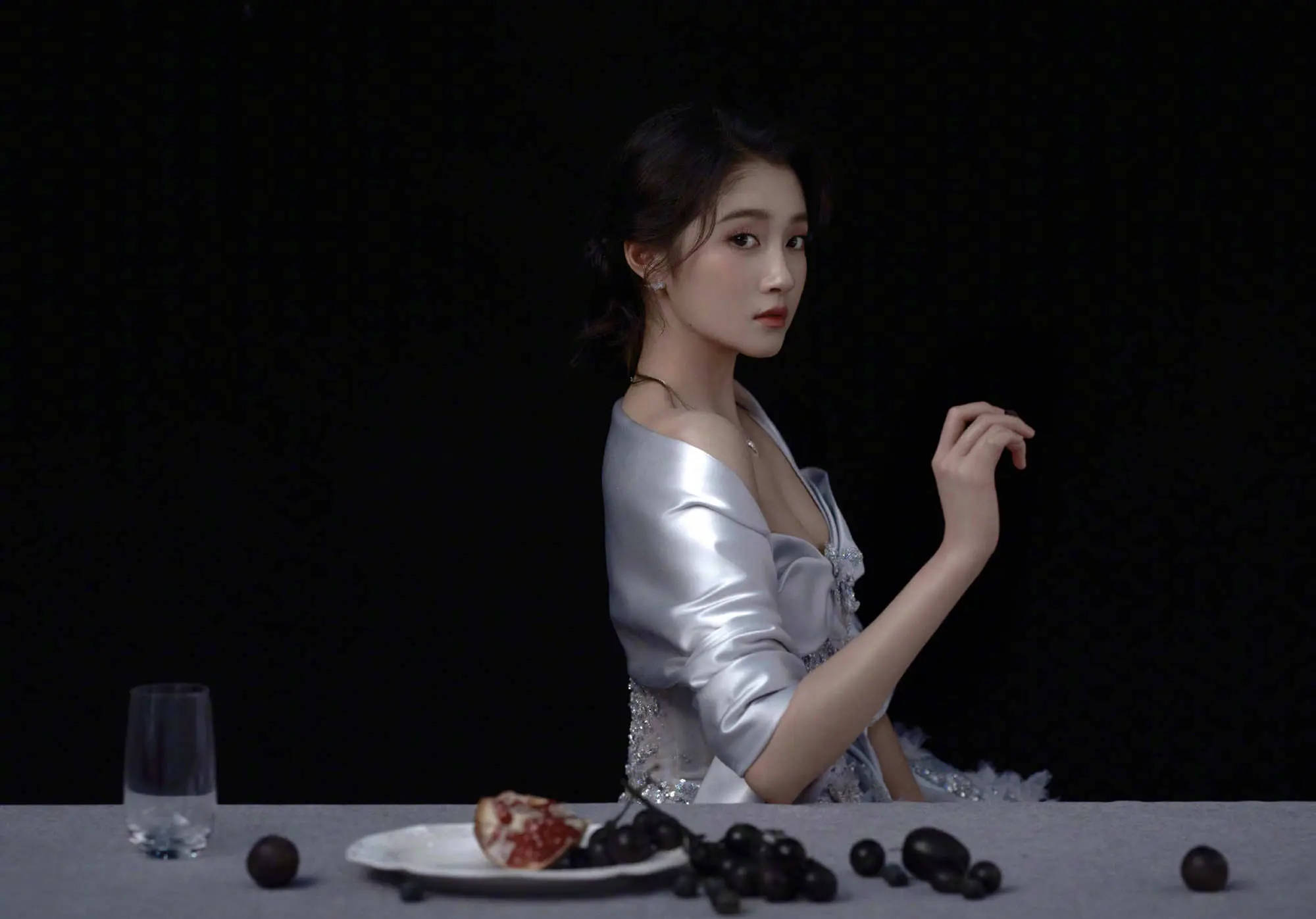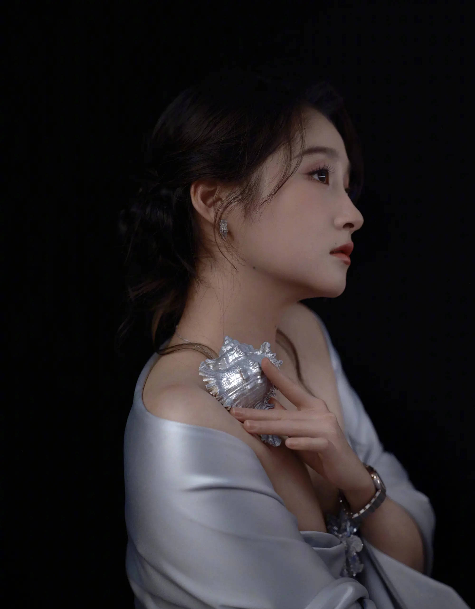 关晓彤妆容细腻,眼神低垂,尽显温婉娇俏气质。