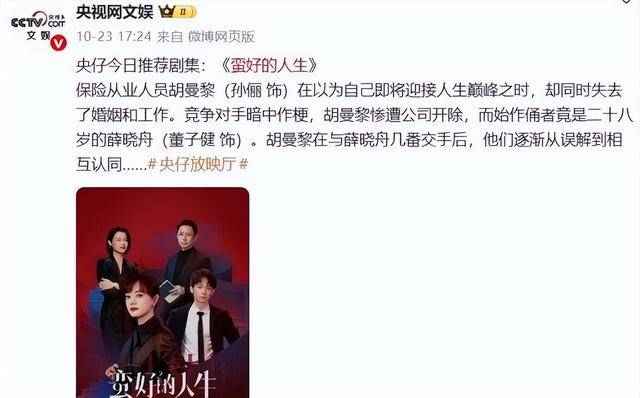 近期,央视网娱发布推荐剧目,将孙俪主演的电视剧《蛮好的人生》列入名单,同时点名孙俪的名字。央视评价孙俪在剧中饰演的保险业务员胡曼黎,让角色具备灵魂重量,表演细节真实,包括谈判时身子前倾、翻合同手指速度、炒菜擦眼泪动作,都贴合生活。同一时间,央视八套持续播出该剧,进一步扩大影响。