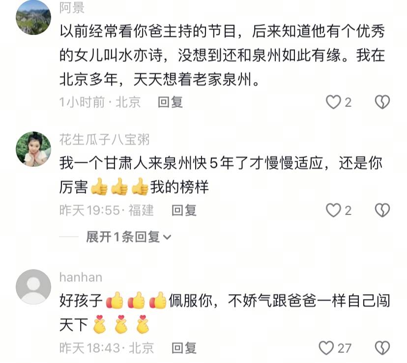 水亦诗的勇气,也让不少网友佩服。她一点都不娇气,跟爸爸一样自己闯天下。也有网友评论说,水亦诗是自己的榜样,来泉州这么短时间就适应了新生活。