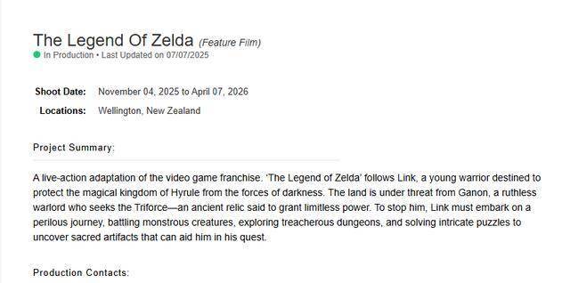根据影视制作网站ProductionList最新更新,任天堂与索尼合作的《塞尔达传说》真人电影已正式进入拍摄阶段。该网站信息显示,影片于2025年11月4日在新西兰惠灵顿开机,计划持续拍摄至2026年4月7日。值得注意的是,此举恰逢《塞尔达传说》系列迎来40周年纪念。