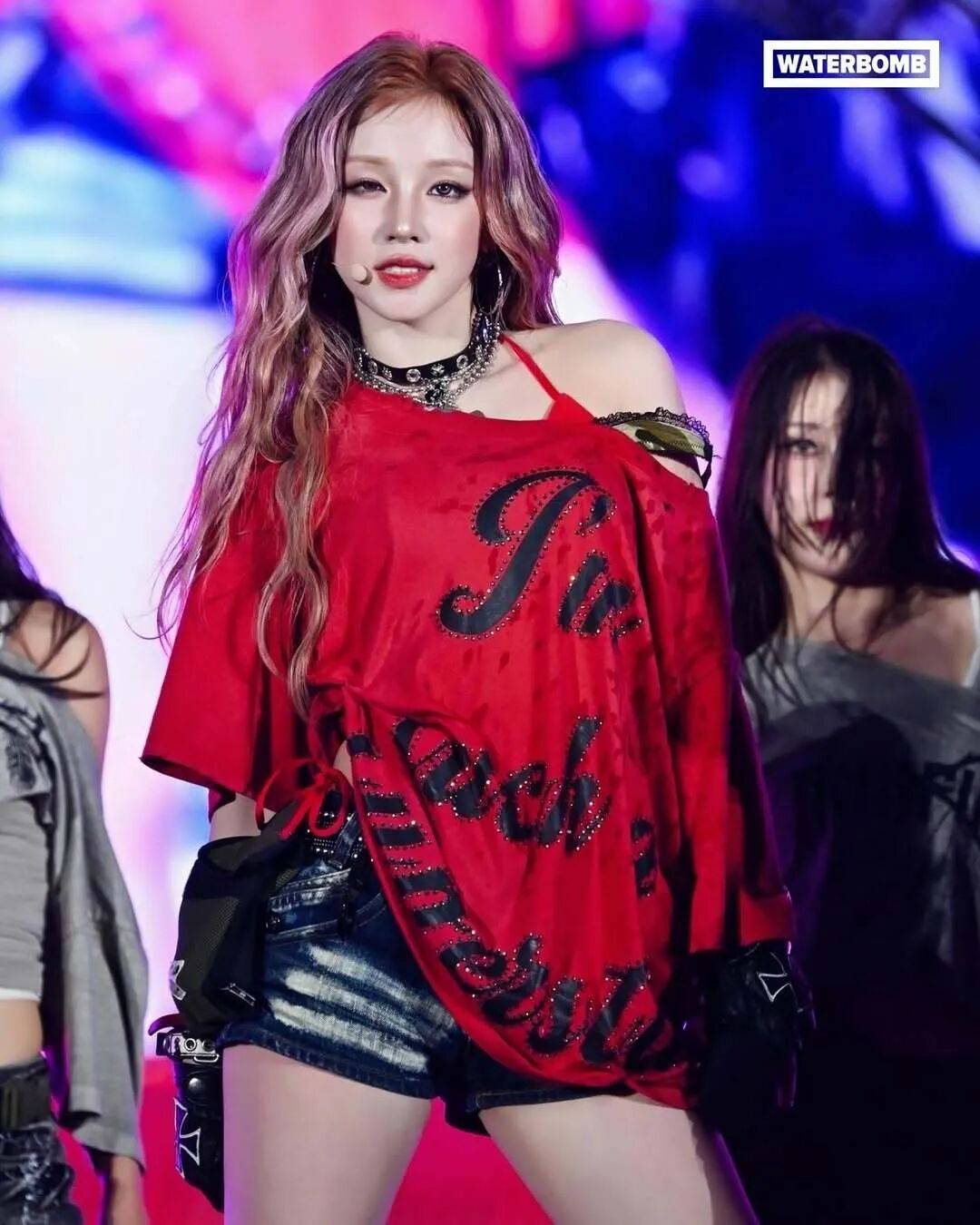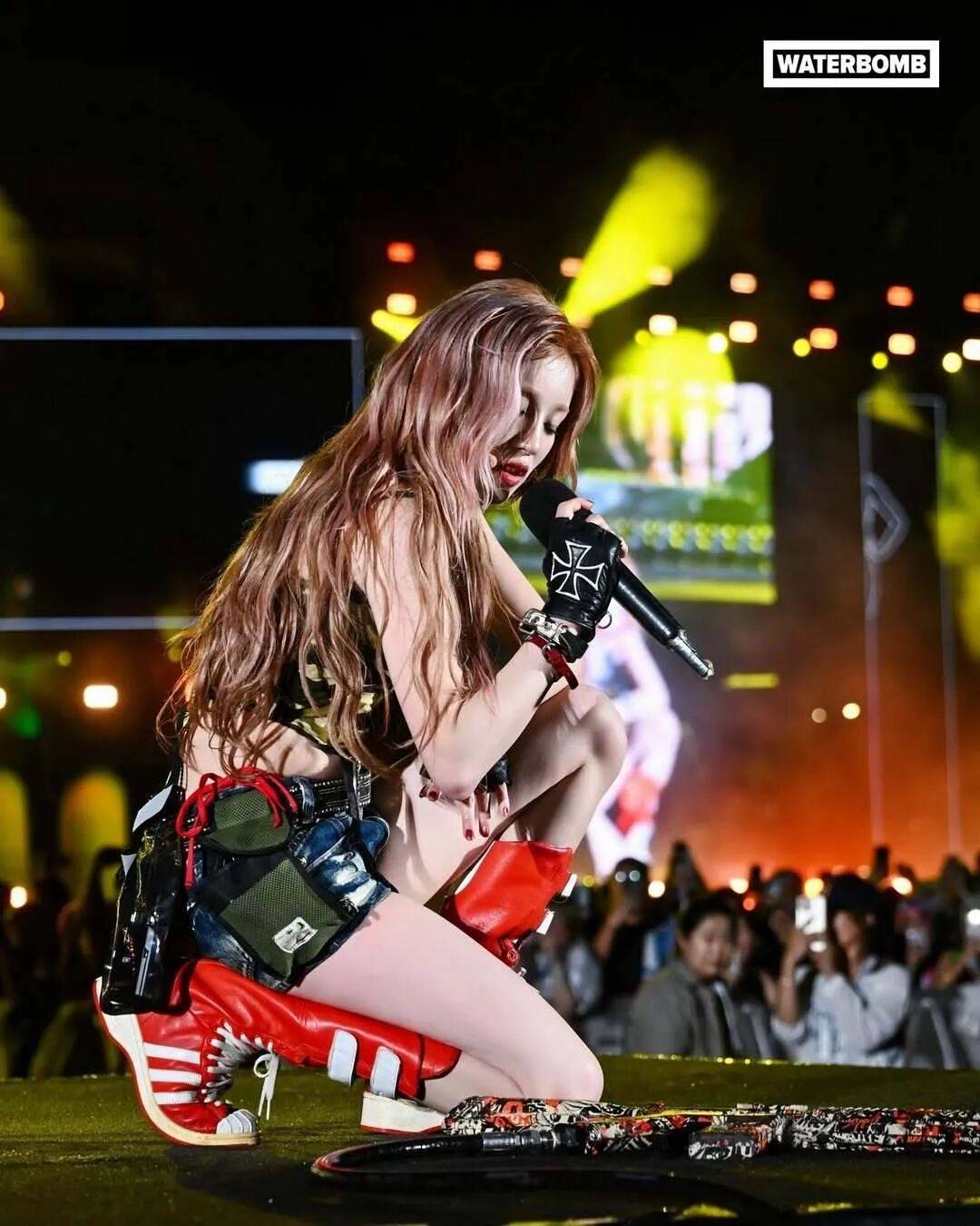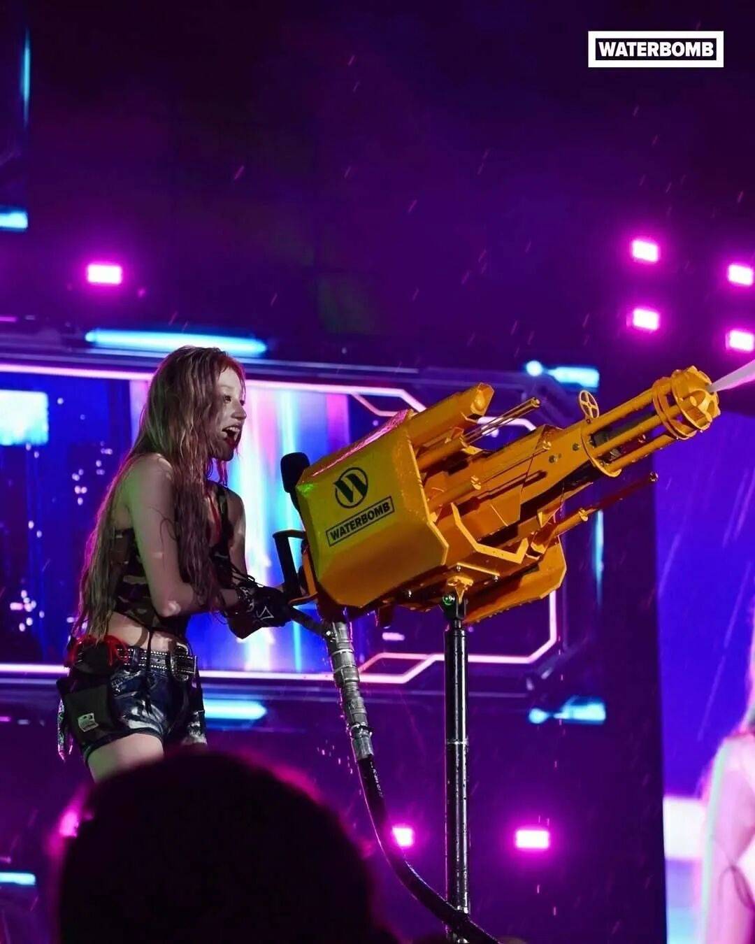 她演唱新歌《M.O.》时手持水枪向观众席洒水,清凉水雾打破舞台边界,观众直呼“被淋湿也心甘情愿”。她配合撩衣动作露出腰腹,瞬间点燃尖叫,被媒体称为“顶级魅惑时刻”。
