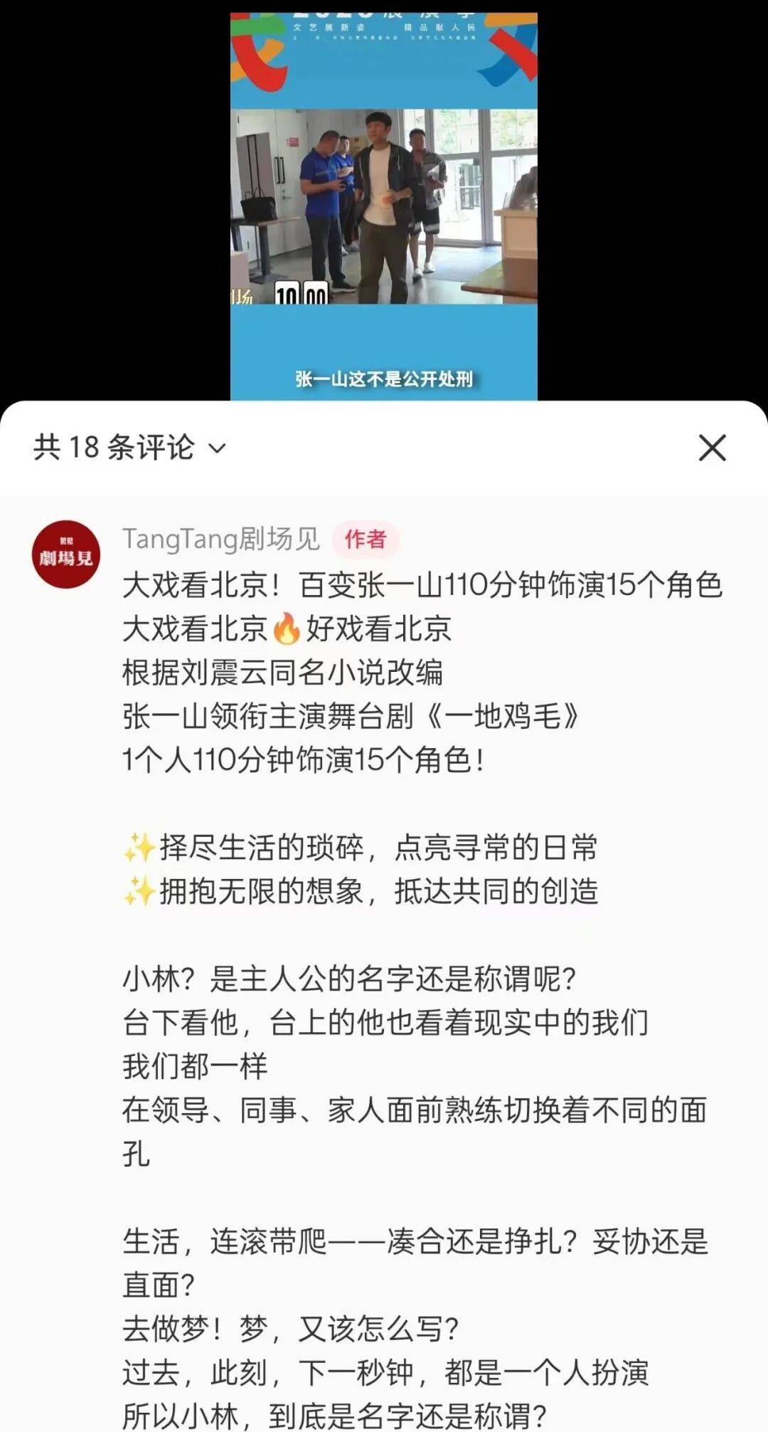 演员张一山主演的独角戏《一地鸡毛》堪称亮点,一人塑造15个性格迥异的人物形象,精湛演技赢得观众阵阵掌声,有观众赞叹“全程被吸引,一人撑起一台戏,太震撼了”。