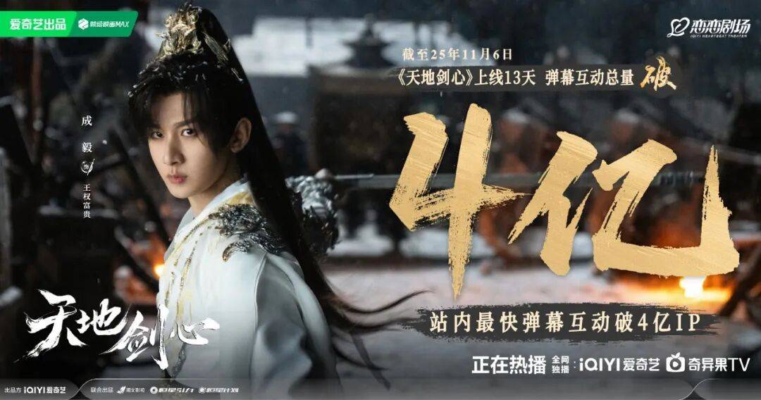 在爱奇艺站内,《天地剑心》最高热度达9014,上线13天弹幕互动总量破4亿,成为爱奇艺站内最快弹幕互动破4亿的剧集;并占据总榜热播榜、总榜热搜榜等爱奇艺站内9大榜单的top1;成毅饰演的男主角王权富贵在爱奇艺桃豆世界角色热度破9亿。在观众与业内的双重好评中,这部定位于“中国古装超级英雄”的剧集打造出了古装剧的新范本。