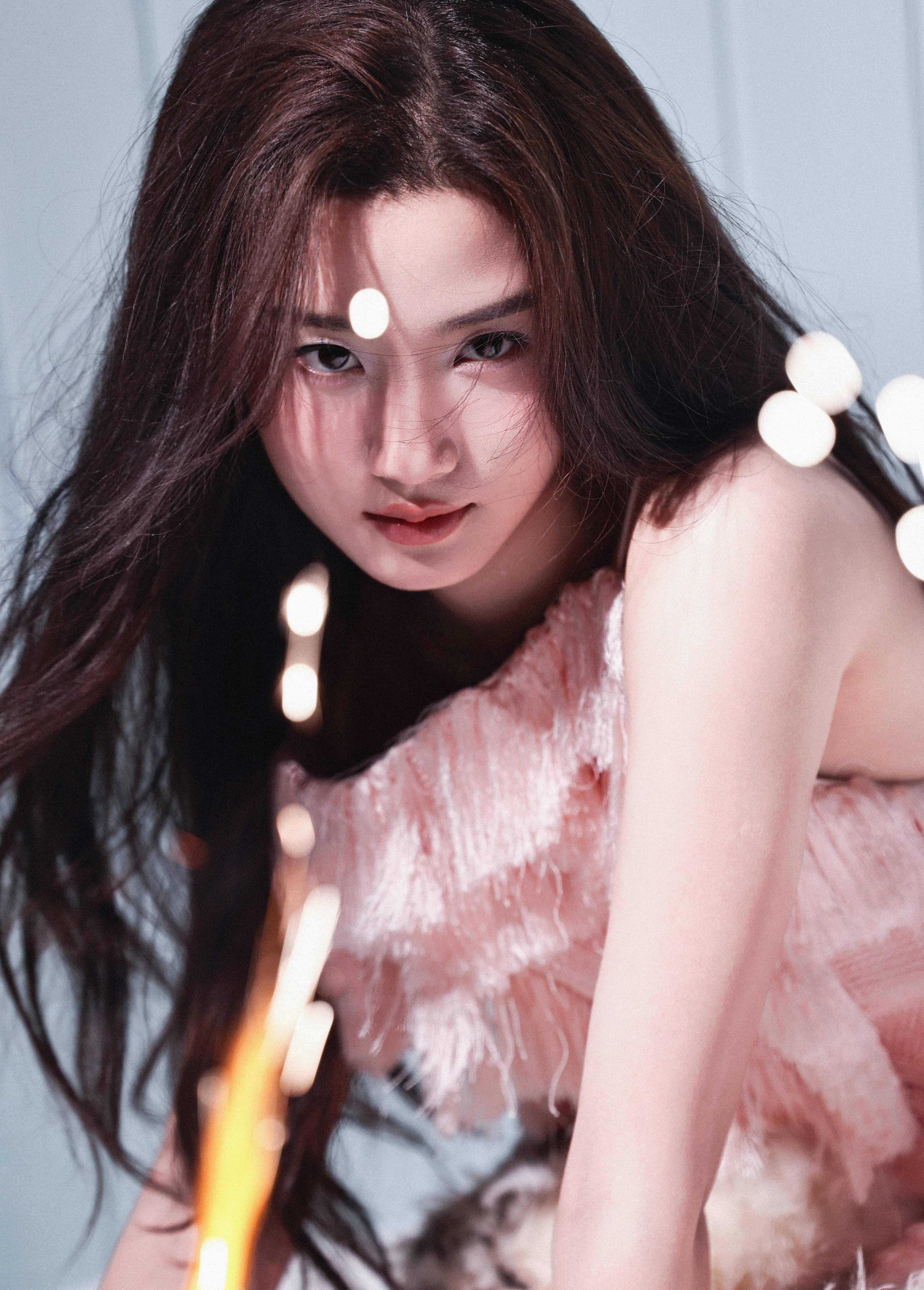 卢昱晓穿粉色连衣裙,卷发造型氛围感十足。