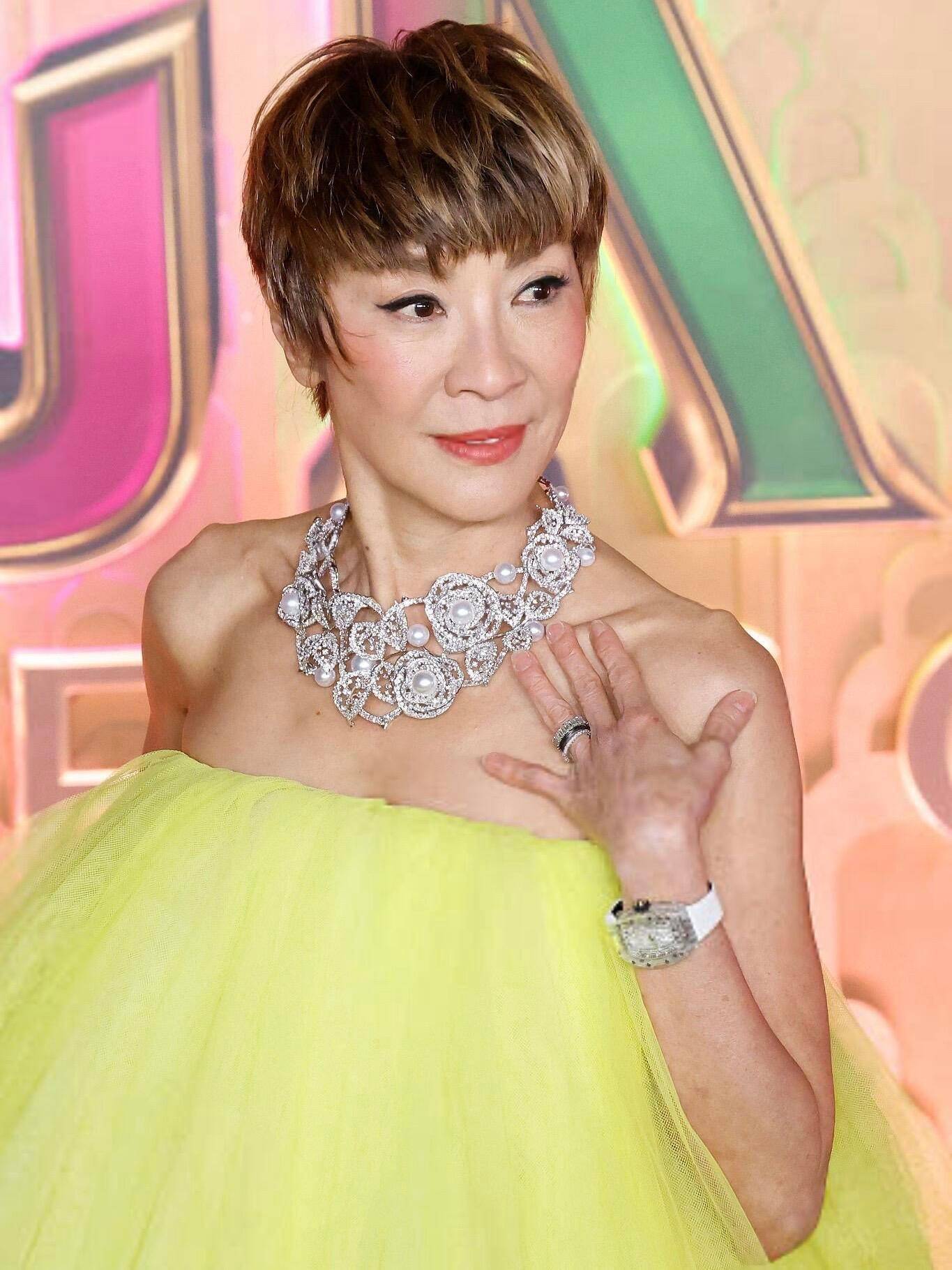 搜狐娱乐讯 《魔法坏女巫2》剧组亮相纽约首映礼,主演杨紫琼一袭鹅黄色抹胸蓬蓬裙配短发俏丽吸睛。