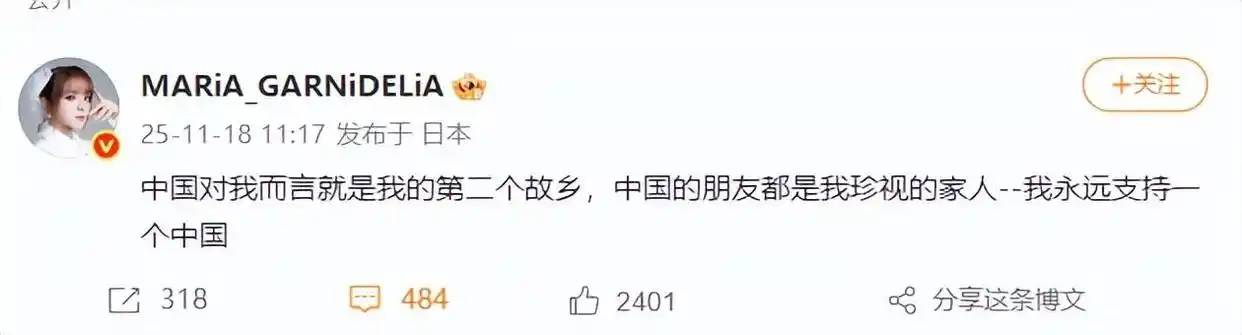 2025年11月18日,美依礼芽通过个人微博(IP地址显示在日本)发文:“中国对我而言就是我的第二个故乡,中国的朋友都是我珍视的家人——我永远支持一个中国。”