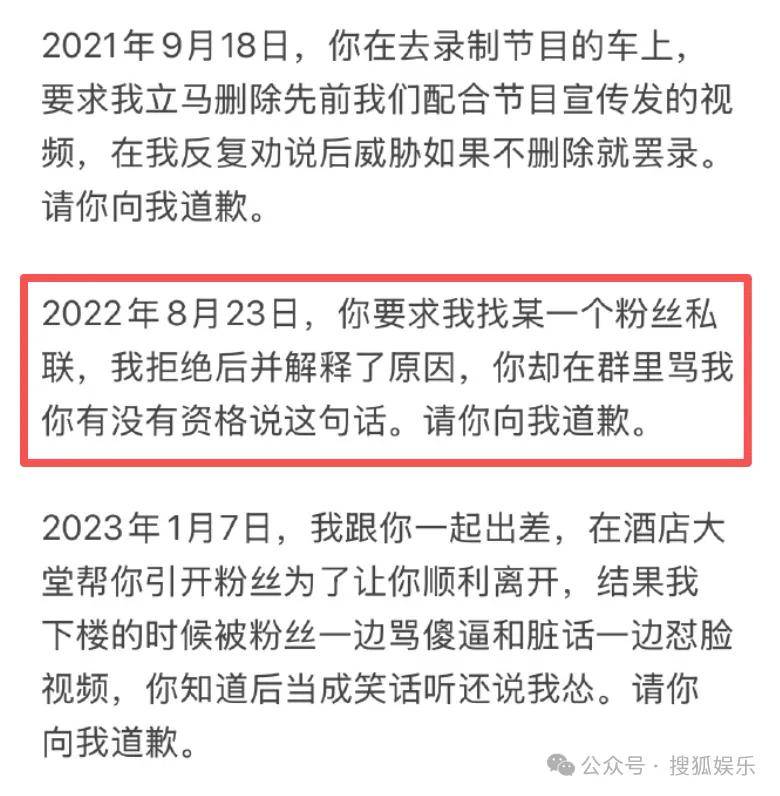 据长文描述,早在2022年的8月23日,曾轶可就曾明确要求工作人员去主动私联某位粉丝,在被拒绝后,反而在群里辱骂工作人员“你有没有资格说这句话”。
