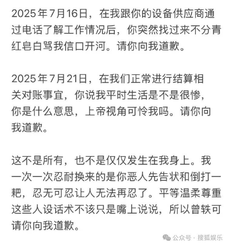 还透露现团队同事曾被她刁难到“崩溃大哭”,是曾轶可本人因看到骂人截图“气到不行”才发出律师函。